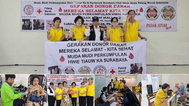 Perkumpulan Perkumpulan Hwie Tiauw Ka Surabaya bersama Harmonis Surabaya Club dan Palang Merah Indonesia (PMI) Surabaya menggelar kegiatan donor darah pada Sabtu, 24 Januari 2026, bertempat di Atom Mall Surabaya. Kegiatan ini berlangsung sejak pukul 09.00 hingga 16.00 WIB dan mendapat sambutan hangat dari masyarakat.